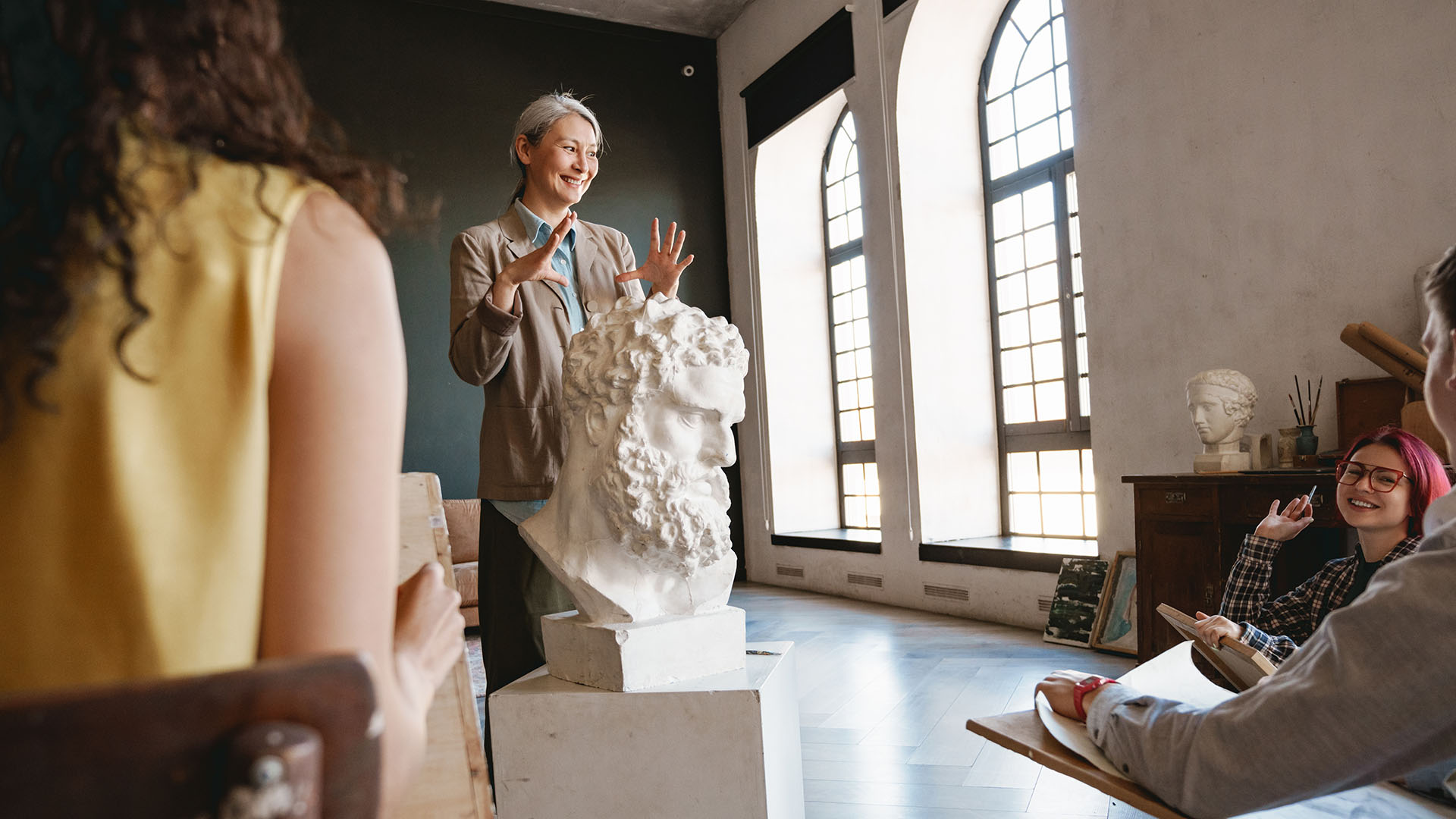 Mature teacher talking with her students during class in art school indoors