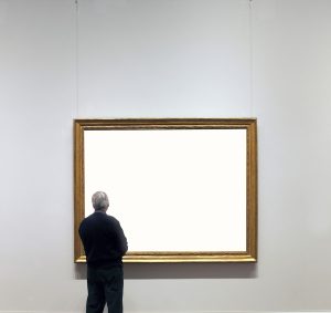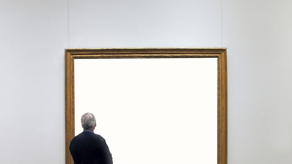 Rear view of man standing in art gallery, looking at empty gilded frame.