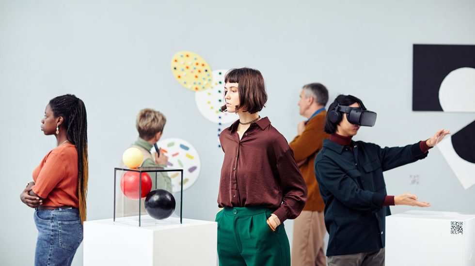 Group of diverse multi-ethnic young and senior people looking at contemporary art objects at exhibition in modern gallery