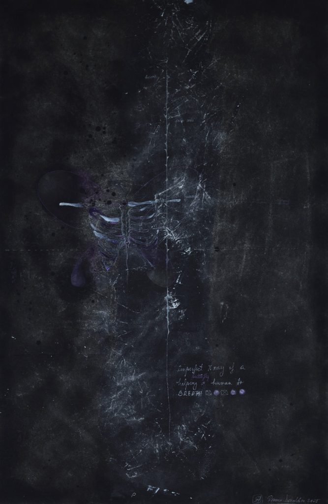 R.D.: Lucrările decid singure când sunt gata; trebuie doar ca artistul să fie atent la ce îi spun ele. Alegerea temei, cercetarea teoretică și explorarea completă au durat cam o jumătate de an și au luat o turnură tensionată, la figurat și la propriu. La final, eram într-o stare de surescitare și încordare nervoasă din care se evadează doar schimbând registrul și lucrând practic. Am decis că nu (mă) mai suport în această ipostază de analist al interiorului și m-am apucat frenetic să desenez diagrame. Prima lucrare terminată a fost Diagrams of Protection Day 1 aka wash, rinse, repeat, restul a curs ca un șuvoi eliberator compus din serii scurte și complementare: radiografii imperfecte, scheme eșuate, sutele de sfere negre.