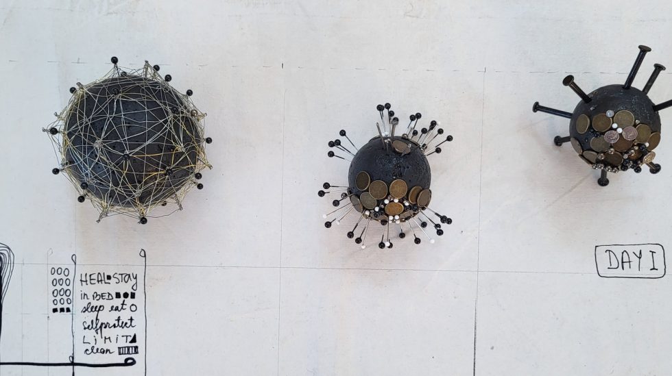 R.D.: Procesul de creație a fost foarte intens și tensionat și cred că se simte asta și în lucrări, în aerul lor tăios, în minimalismul cromatic. Instalațiile-expoziții Safety First! și The Aftermath au crescut din seria de lucrări Diagrams of Protection. Acestea constituie punctul zero al tensiunii dintre rațiune și emoție. Sunt pânze libere inscripționate cu tuș, care folosesc subversiv limbajul tehnic și vorbesc despre încercări eșuate și succesive de a cartografia, explica și înțelege, prin dimensiuni științifice și raționale, senzația de anxietate, frica de a fi răniți, dorința de protecție – toate împinse la cote maxime.